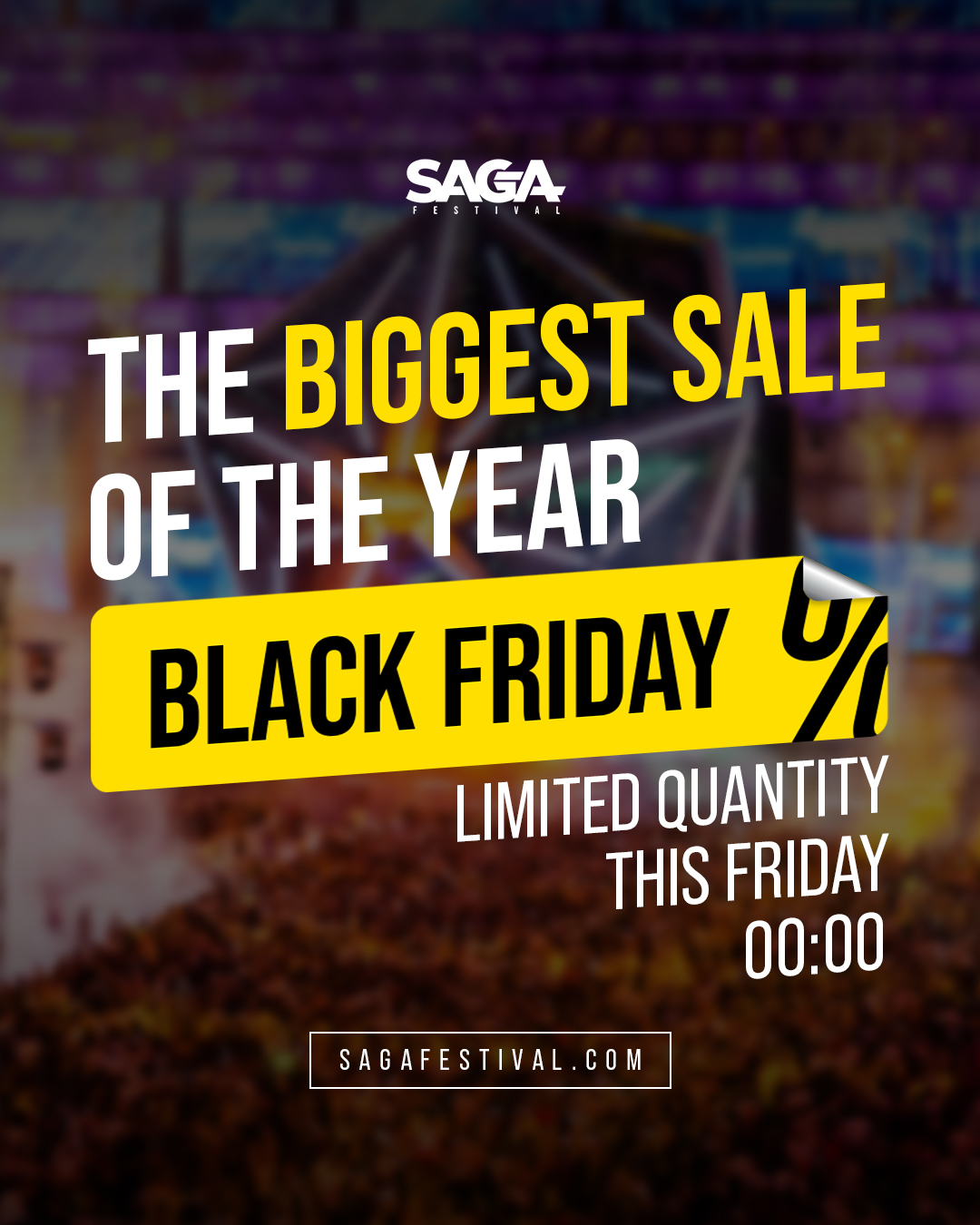 De Black Friday, începând de vineri, 11 noiembrie, de la ora 00:00, până luni, 14 noiembrie, la ora 00:00, SAGA pune în vânzare o cantitate limitată de bilete pentru cea de-a treia ediție a festivalului, la prețul de 55 euro + taxe. Doar săptămâna aceasta, în cele trei zile, biletele GA pot fi achiziționate la prețul special, cu o reducere de aproape 100 de euro față de prețul final.