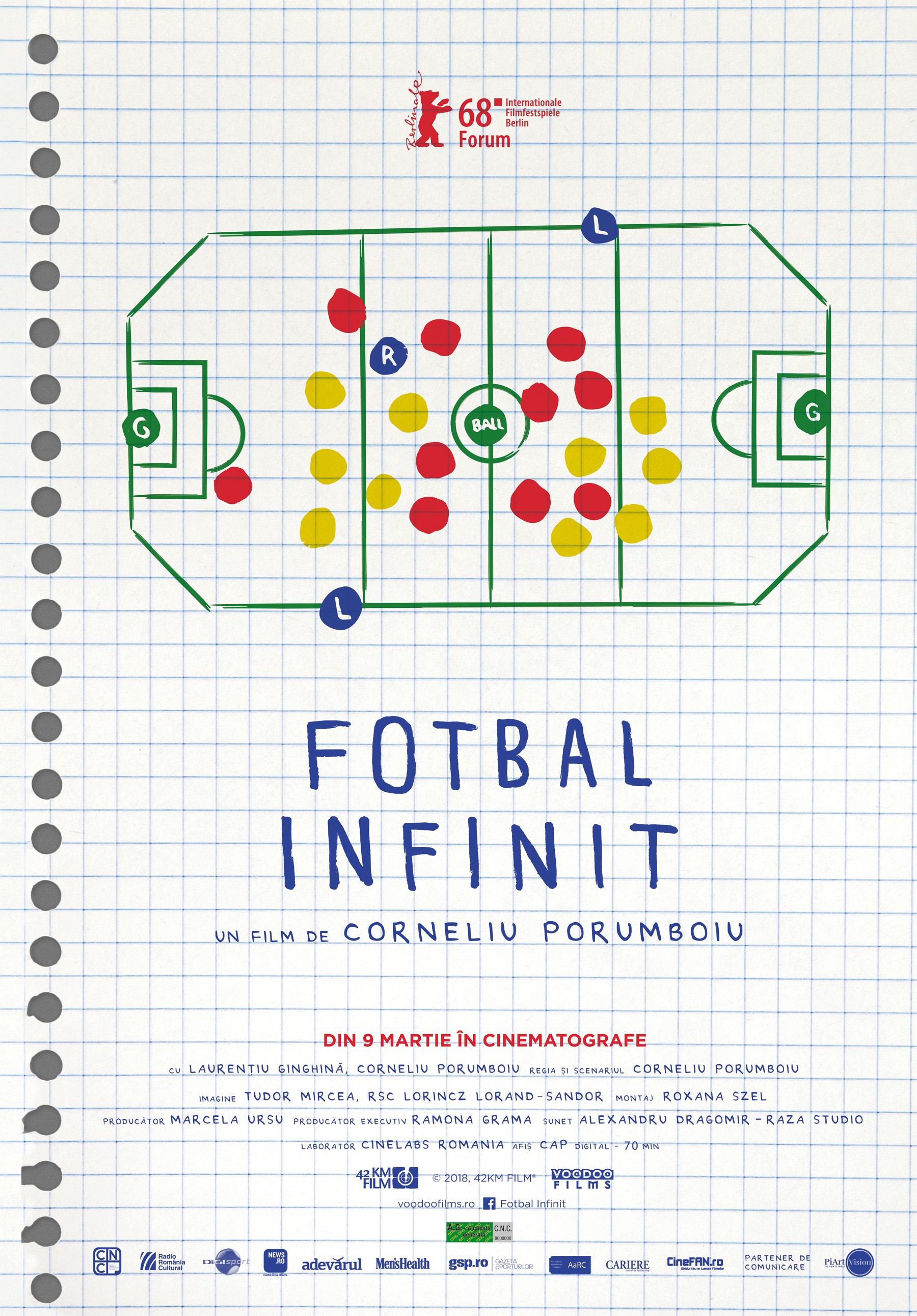 Cel mai nou film al regizorului Corneliu Porumboiu, Fotbal infinit, intră în cinematografele din România începând cu 9 martie, după ce a fost prezentat în premieră mondială la Berlin, unde s-a bucurat de aprecierile criticilor. Filmul, care prezintă o abordare inedită a jocului de fotbal, „a fost lansat într-un context cum nu se putea mai potrivit, în anul unei Cupe Mondiale”, a scris „Hollywood Reporter”.