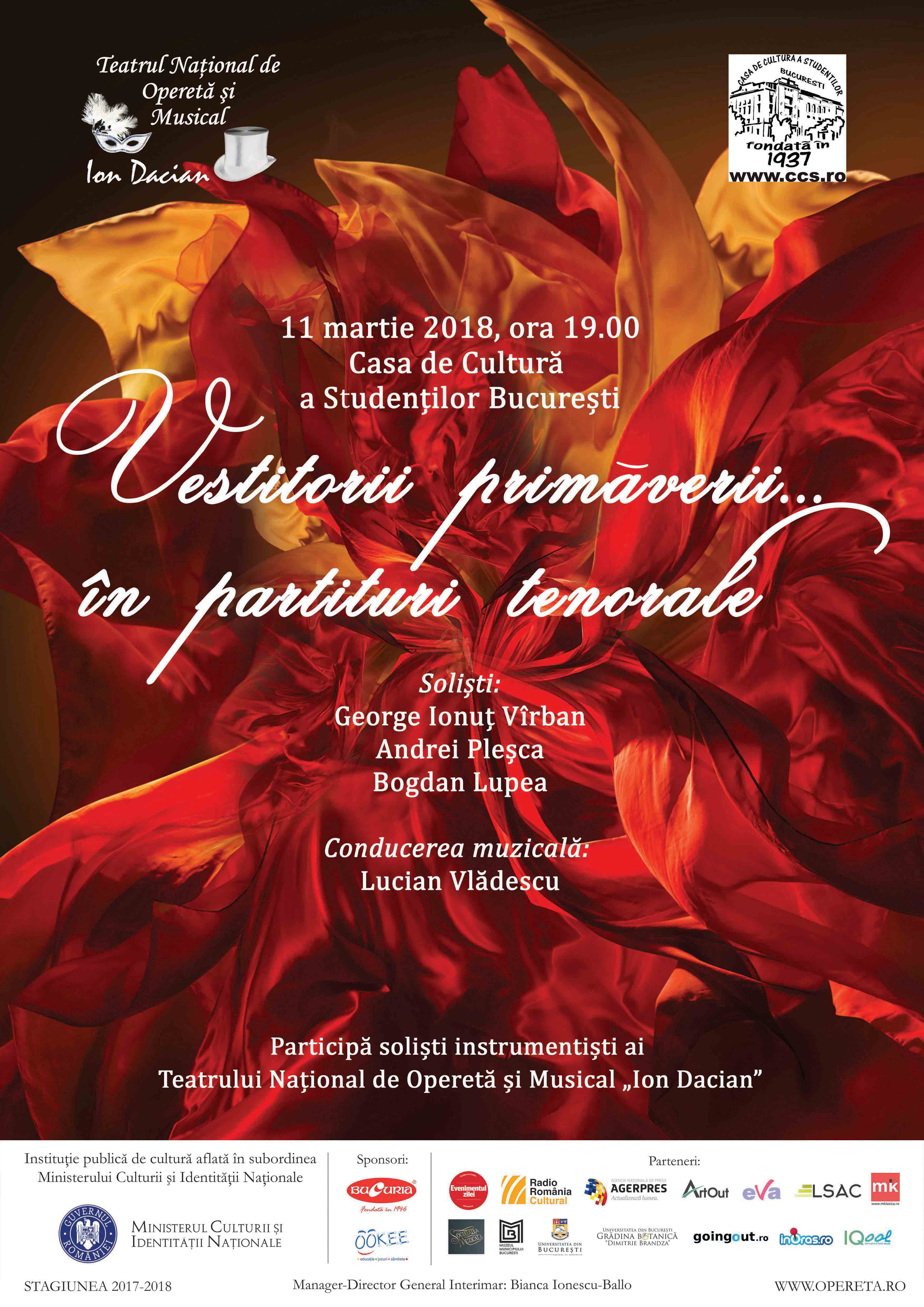 Gabriela Daha, Daniela Bucșan, Andrei Pleșca, Bogdan Lupea, Orest Pîslariu-Ranghilof, Stefan Popov, Cătălin Petrescu, Valentino Tiron, Jeaninne Bradler, Ioana Băiaşu, Corina Plopeanu, Carmen Angheloiu, Alois Doboş, Răzvan Rusu, Bogdan Ardeleanu, Alexandru Vasile.Pe 11 martie, de la ora 19:00, “Vestitorii primăverii… în partituri tenorale” este un spectacol realizat în parteneiat cu Casa de Cultură a Studenților din București.