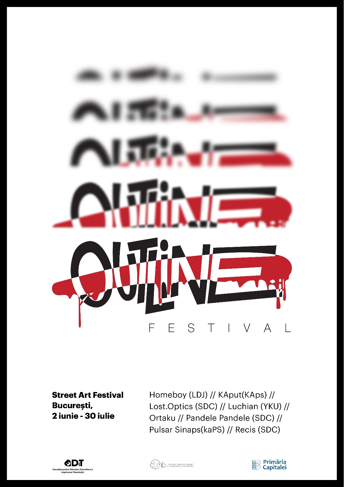Primaria Municipiului Bucuresti, prin Centrul pentru Tineret al Municipiului Bucuresti (CTMB), organizeaza, in perioada 2 iunie – 30 iulie, Outline Festival, un eveniment care isi propune sa puna Bucurestiul pe harta marilor capitale ale lumii in ceea ce priveste arta
