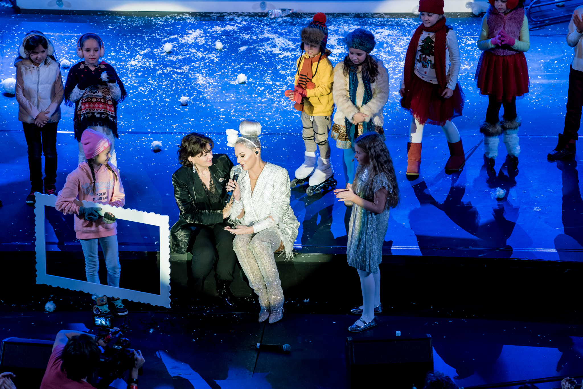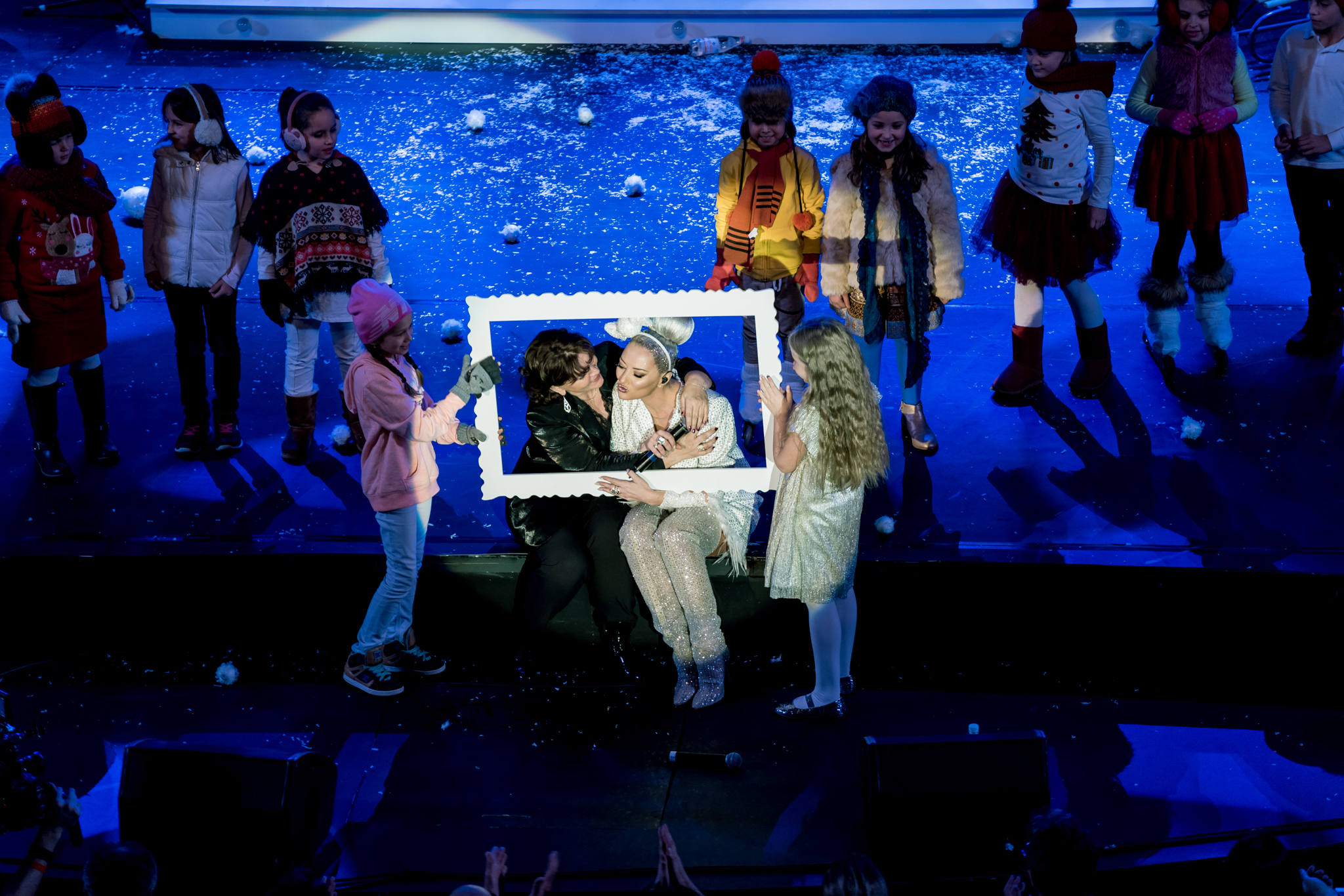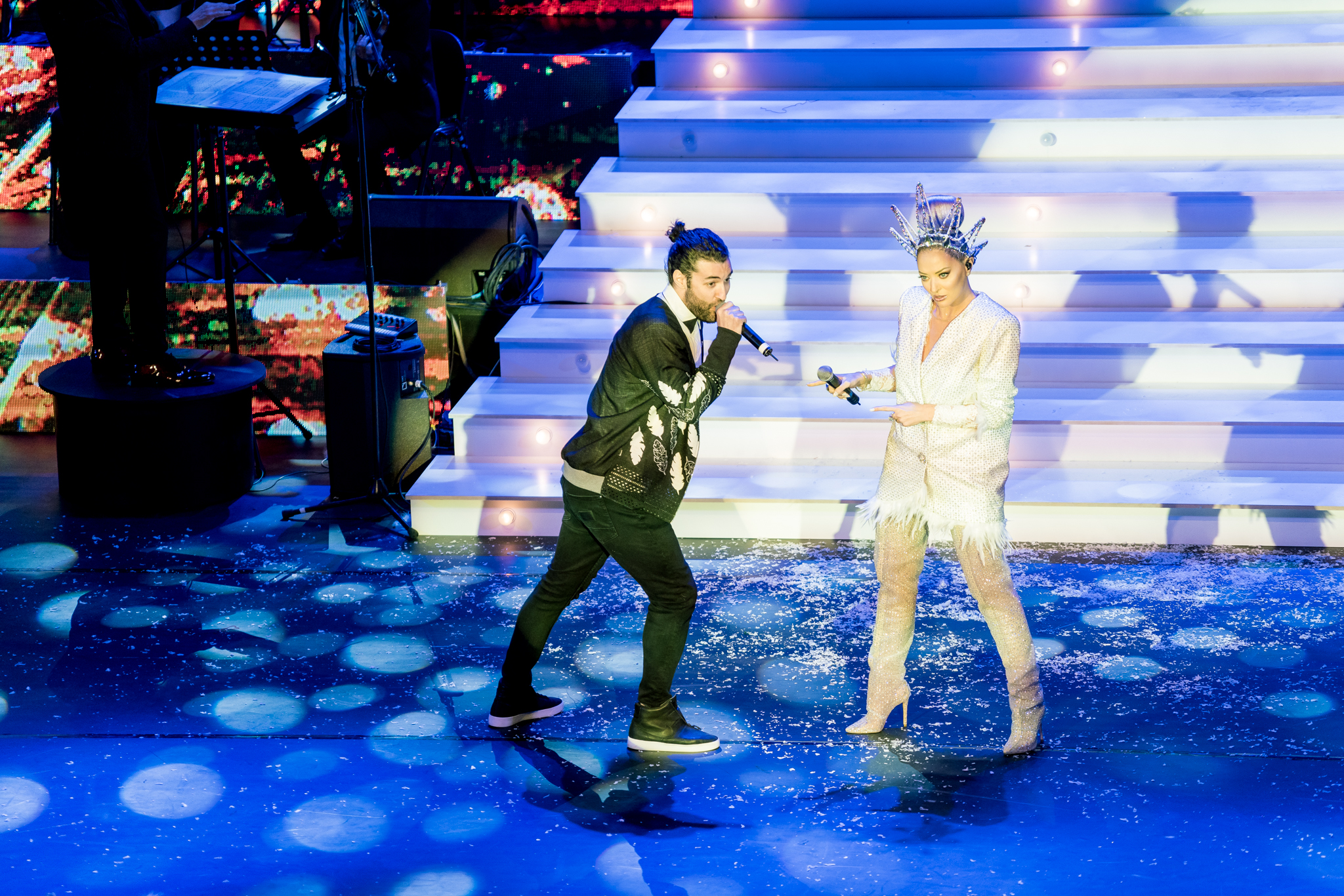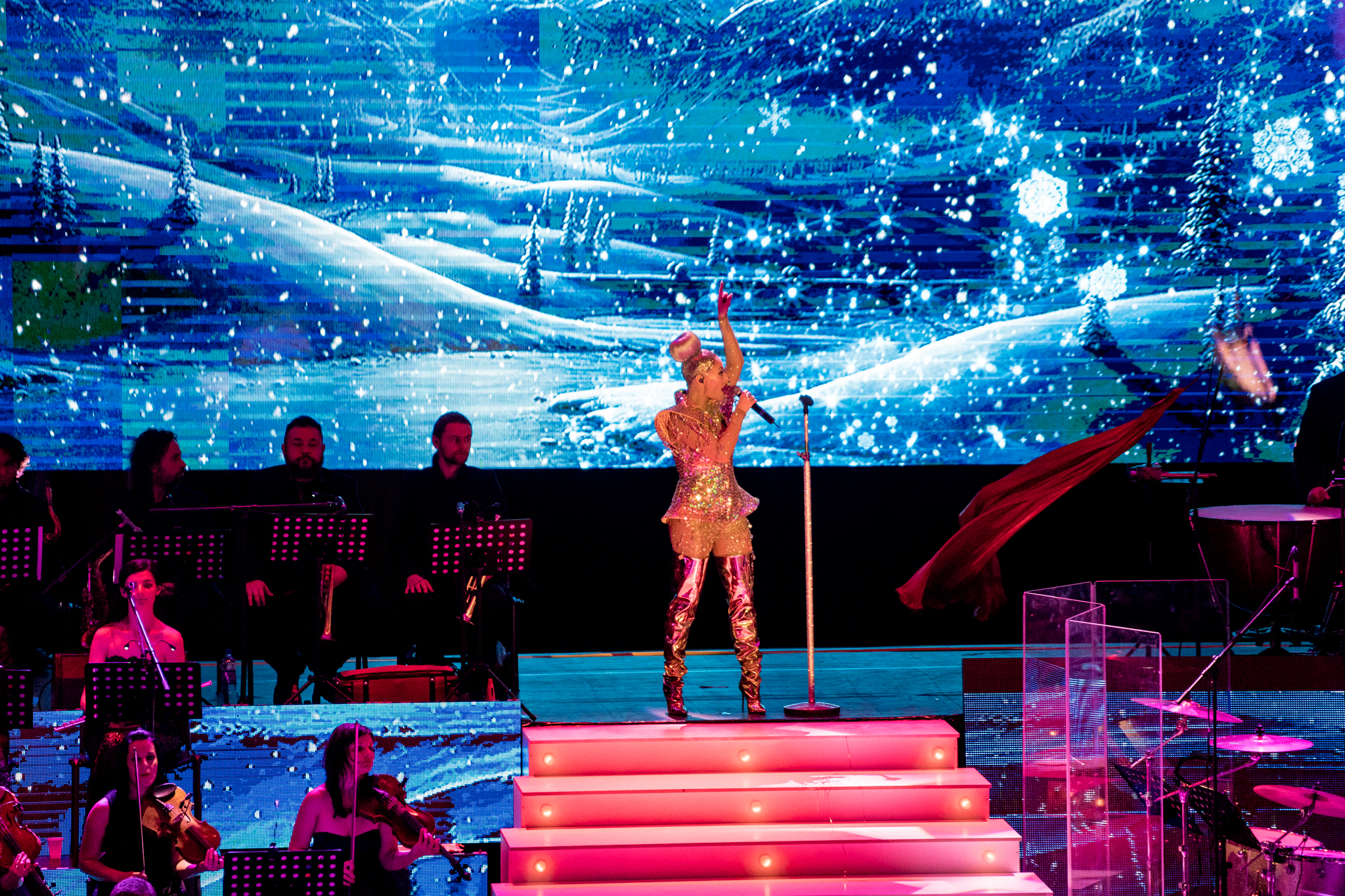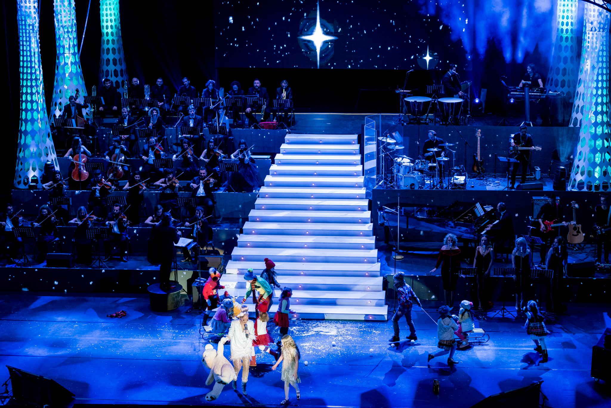 Grafica expusa in peste 200 de module de ecran led si facuta dedicat pentru acest show de catre NRG Moldova a avut ca laitmotiv fulgul de nea, concept in jurul caruia s-a si construit intregul show, iar scenografia grandioasa a conturat perfect starea de taram magic al iernii. Si cand spunem magic, ne referim pana si la brazi, caci in Delia’s Winter Wonderland am descoperit bradul uman, dispus pe 3 etaje si format din 6 fete-brad care au dansat in sincron.