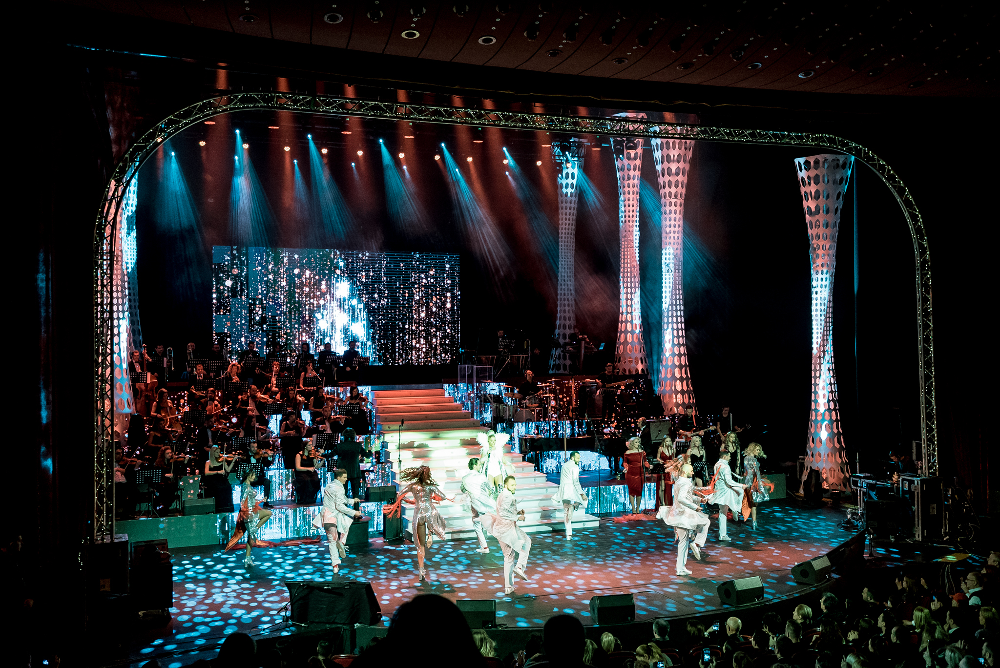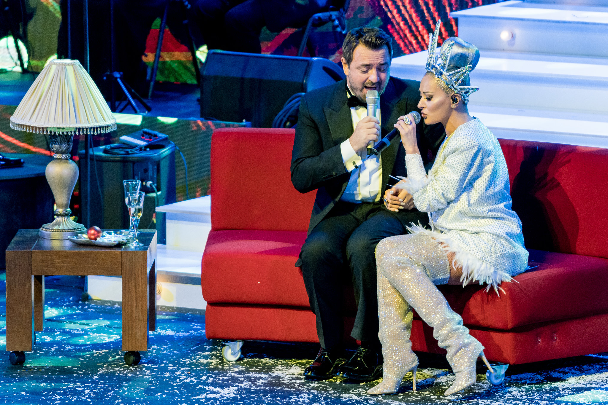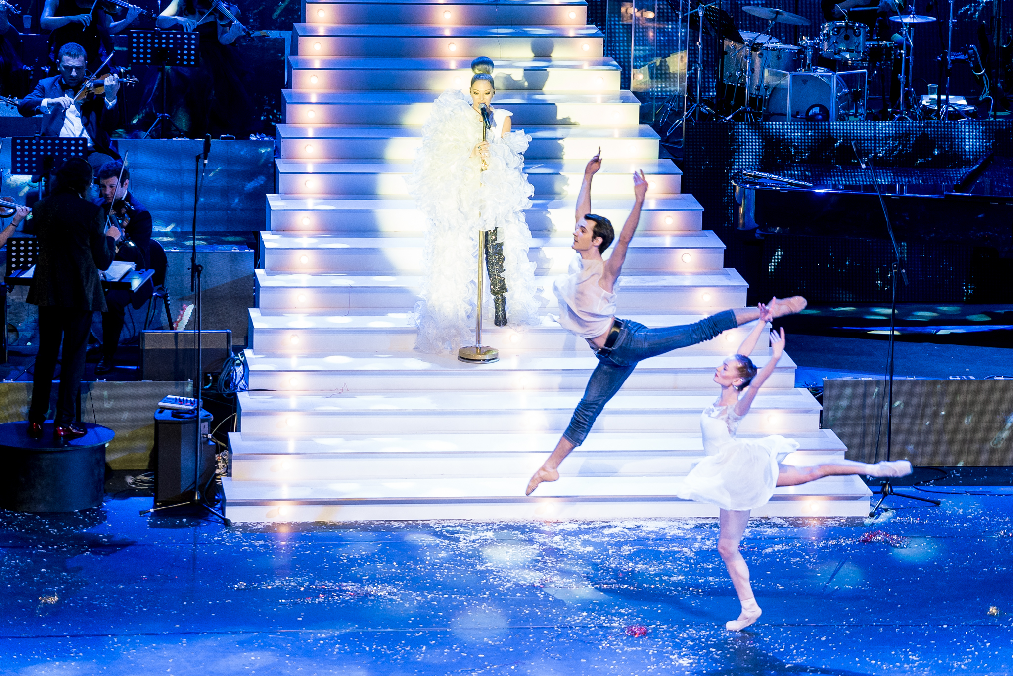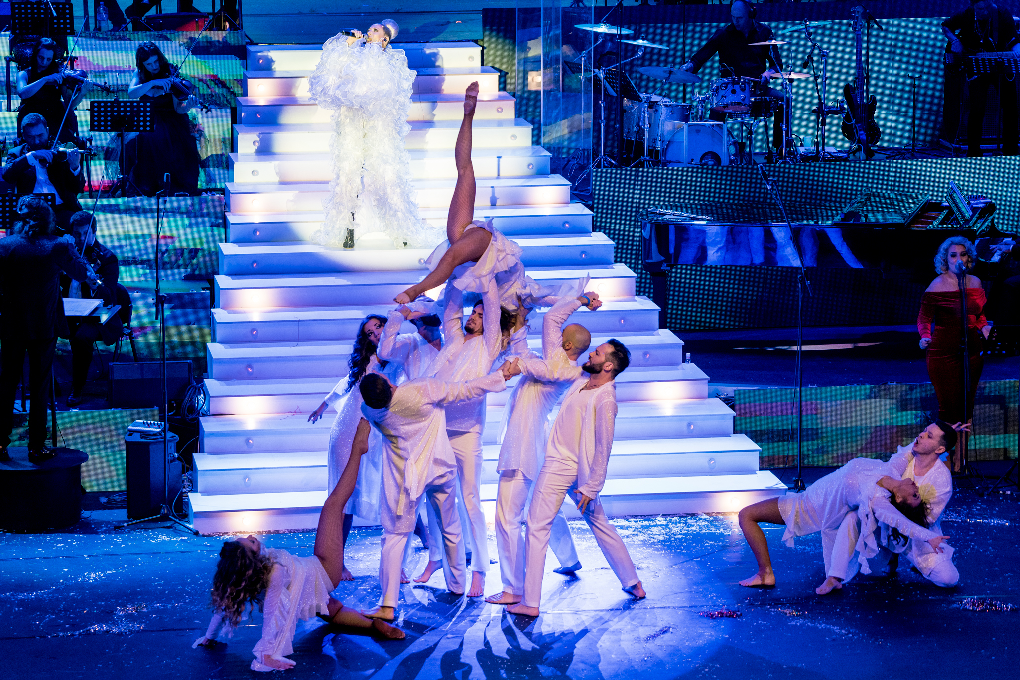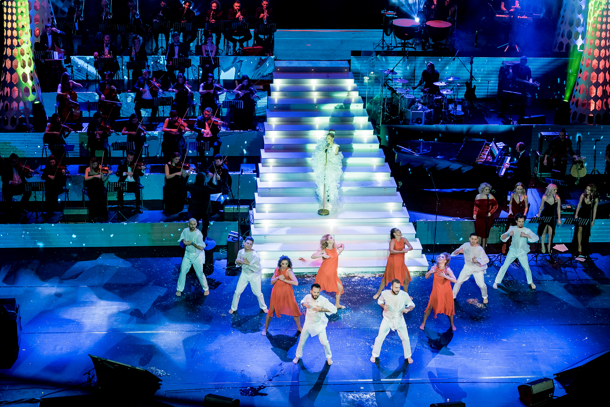 Grafica expusa in peste 200 de module de ecran led si facuta dedicat pentru acest show de catre NRG Moldova a avut ca laitmotiv fulgul de nea, concept in jurul caruia s-a si construit intregul show, iar scenografia grandioasa a conturat perfect starea de taram magic al iernii. Si cand spunem magic, ne referim pana si la brazi, caci in Delia’s Winter Wonderland am descoperit bradul uman, dispus pe 3 etaje si format din 6 fete-brad care au dansat in sincron.