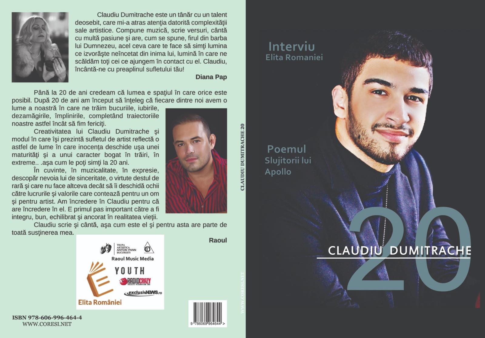 După ce și-a lansta primul volum de poezii anul trecut, Claudiu Dumitrache, cântăreț, compozitor, jurnalist și scriitor, a lansat joi, 21 noiembrie la Târgul Internațional de Carte Gaudeamus, prima biografie. Publicația cuprinde un interviu acordat pentru Elita României, o selecție de creații și recenzii asupra creației sale făcute de personalități ca Romanița Iovan, Eb Davis, Raoul, Dida Drăgan sau Michael Airington. De asemenea, în revistă se regăsesc și două recenzii literare făcute de prof. Ștefan Lucian Mureșanu și prof. Valentina Vasile. “20” de Claudiu Dumitrache a fost publicat de această dată de Editura Coresi. În aceeași zi și la aceeași editură a avut loc și lansarea cărții “Tot ce nu ți-am spus” a cântarețului Raoul care a întegistrat un mare succes.